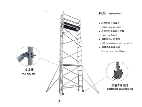 当今市场上大多数的脚手架都是以铁、钢材为主,而该类型材质的脚手架使用起来很笨重,并且整体设计简陋,安全性能方面较低,从而导致市上频频发生脚手架意外坍塌等安全事故。而在其一些发达国家,早已兴起一种铝合金材质的脚手架,并广泛被企业用户选用。因其部件连接强度高、支撑机构设计科学,整体结构安全稳固。整体采用轻便、坚固的铝合金为材质。脚手架重量远远轻于传统的脚手架,因而在使用起来很方便。