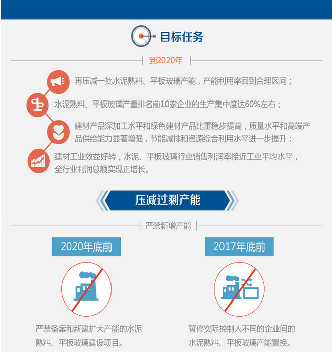 意见设定目标任务:到2020年,再压减一批水泥熟料、平板玻璃产能,产能利用率回到合理区间;水泥熟料、平板玻璃产量排名前10家企业的生产集中度达60%左右;建材产品深加工水平和绿色建材产品比重稳步提高,质量水平和高端产品供给能力显著增强,节能减排和资源综合利用水平进一步提升;建材工业效益好转,水泥、平板玻璃行业销售利润率接近工业平均水平,全行业利润总额实现正增长。