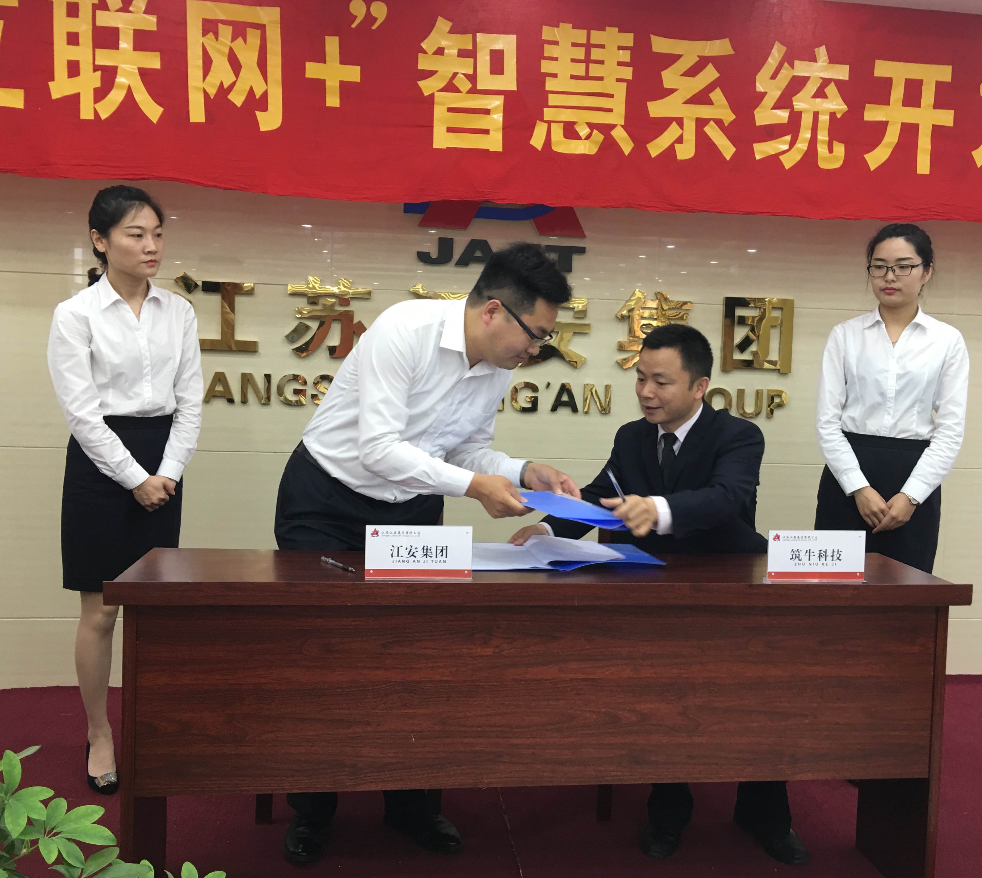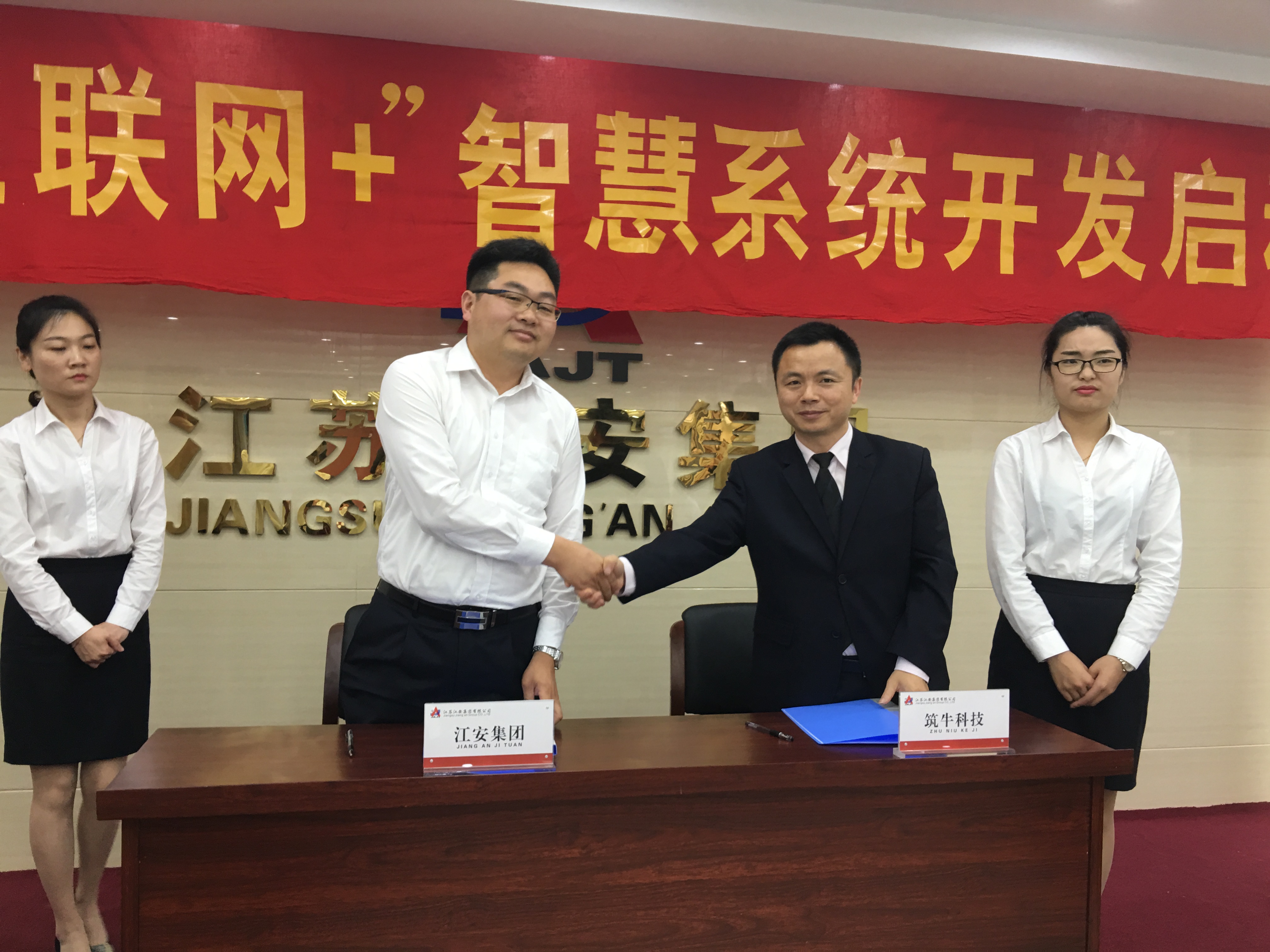最后,江安集团总工程师袁日勇先生和筑牛科技董事长王继洲博士作为双方代表完成了仪式签约。在签约仪式结束之后,王博士和江建集团、江安集团的高层领导合影留念。