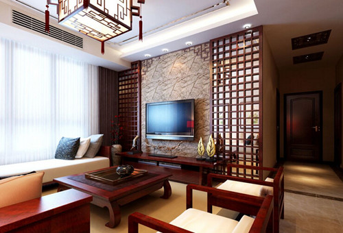中式电视背景墙的设计主要从颜色、材料、造型上着手装修,中式电视背景墙讲究古朴怀旧、再加上中式装饰雕花、隔栅、屏风的点缀,怀旧与情调的搭配、天然与朴实是中式电视墙的魅力所在。
