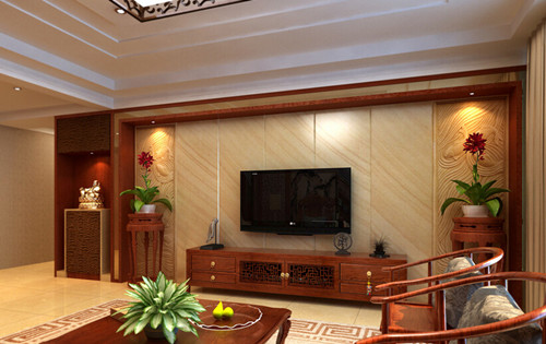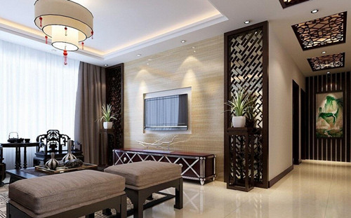 在风格选择上一般采用的是古典风格,因此不管是中式电视墙旁边镂空的木质设计,还是中式电视墙古典气质的花纹,都给我们带来一种清晰的风格,这样更能体现出中式风格的魅力。