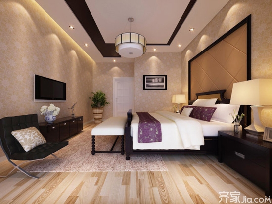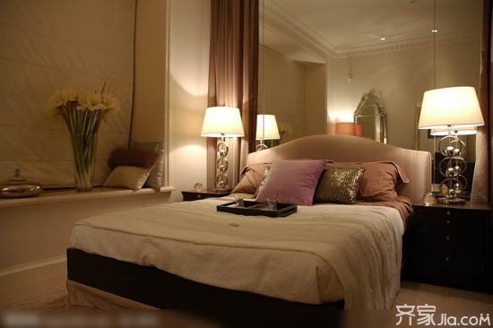 尽量不要使用装饰性太强的悬顶式吊灯,它不但会使你的房间产生许多阴暗的角落,也会在头顶形成太多的光线,躺在床上向上看时灯光还会刺眼。最好采用向上打光的灯,既可以是房顶显得高远,又可以使光线柔和,不直射眼睛。除主要灯源外,还应设台灯或壁灯,以备起夜或睡前看书用。另外,角落里设计几盏射灯,以便用不同颜色的灯炮来调节房间的色调,如黄色的灯光就会给卧室增添不少浪漫的情调。