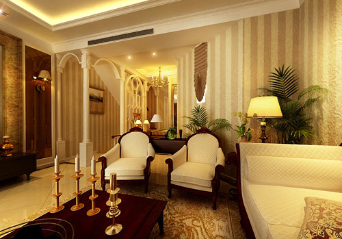 欧式客厅顶一般用大型灯池,并用华丽的枝形吊灯营造气氛。门窗上半部多做成圆弧形,入厅口处多有豪华的罗马柱,墙面最好用壁纸,或选用优质乳胶漆,这一切元素对烘托豪华效果起到很大的作用。