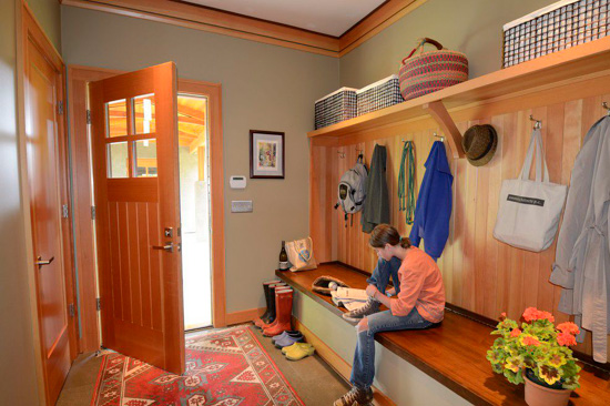 玄关的房型略有些空间可以施展的家庭,可以考虑定做全柜体式,将玄关布置成一个比较完整的空间,以柜厢和搁板等相结合,运用集零碎为整体等各种设计手法,组成一个集收纳和美观于一身的玄关。