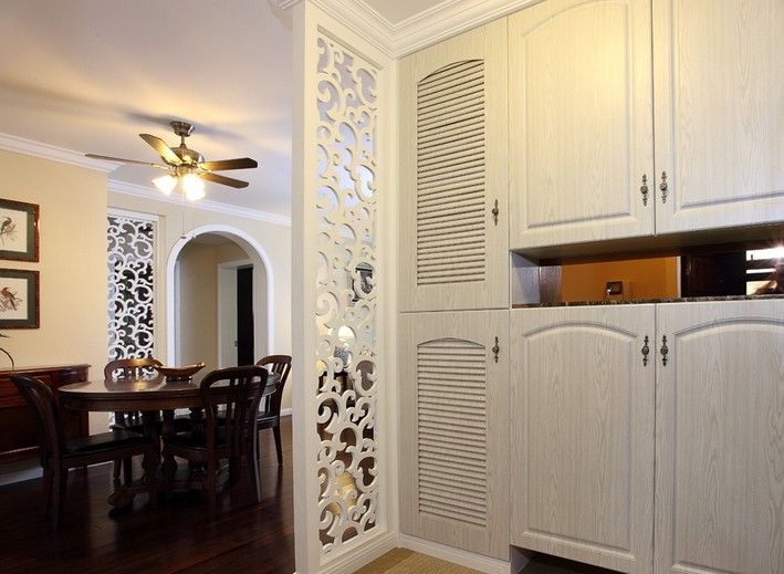 这种玄关设计方式将收纳和换鞋功能融为一体,用半敞开式收纳柜把空间划分开来,落地部分是完全遮蔽式柜体设计,用于日常收纳储物之用;柜体台面可利用起来做沙发和坐凳使用;上半断则为敞开式,可设半开式储物格增加储物空间,柜体顶部连同天花板,通常该种隔断墙高度约为1.5米,利用线条设计的变换、墙面挂置摆件饰品等使用装饰物,从而提升该空间视觉效果。