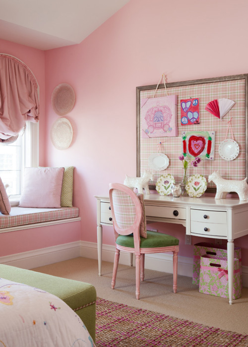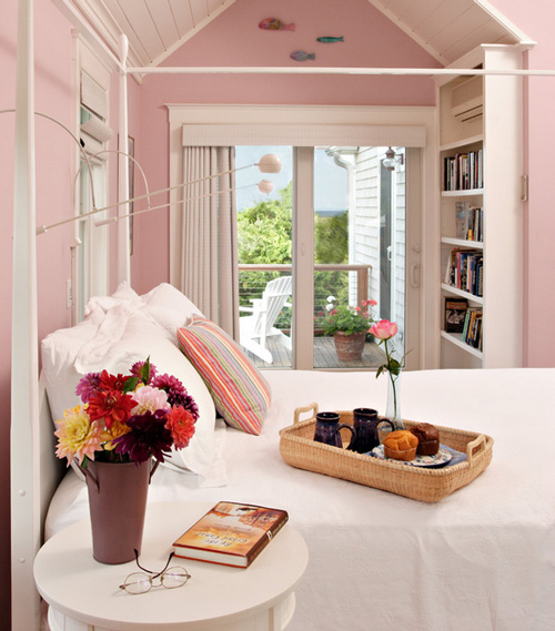 绿色和粉色的搭配,有出乎意料的清爽。超美超幸福的卧室,好想从此君王不早朝。