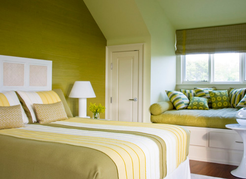 非常明亮清新,跳跃着夏天的明快感。不同明度的绿,有不同的设计语汇。草绿色配小鸭黄,多了一些温柔缱绻。如果打算婚后立即造人,儿童房采取同样的配色也是不错的选择。