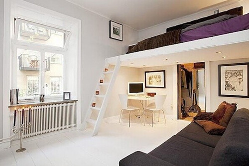 小户型里家具的形式和尺寸直接影响我们的空间感受。造型简单、质感轻、小巧的家具,尤其是那些可随意组合、拆装、收纳的家具比较适合小户型。小户型居室放置家具的另一大特色就是向纵向发展。如选择高脚的床具,这样一来可将床面抬高,不知不觉中增加了床面以下的可利用空间,或者干脆买张两用床,白天收起当沙发,晚上放下当床铺,一举两得。