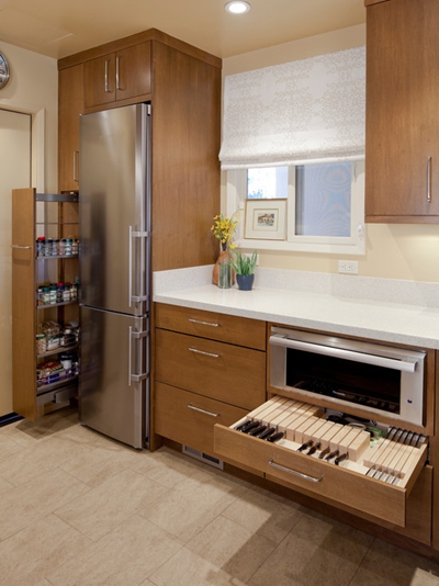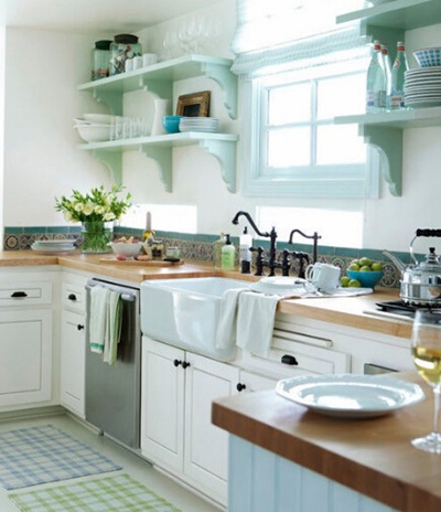 厨房的功能决定了它是居家环境最易“脏、乱、差”的地方。如何让厨房美观整洁,是厨房装修的除功能便捷以外的另一重要目的。要充分利用空间,利用台柜、吊柜等,给锅、碗、瓢、盆找一个相对妥善的收放空间。厨房里的矮柜最好做成抽屉,推拉式方便取放,视觉也较好。而吊柜一般做成30到40厘米宽的多层格子。