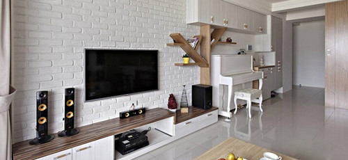现代简约风格的特色是将设计的元素、色彩、照明、原材料简化到最少的程度,但对色彩、材料的质感要求很高。上图的电视背景墙非常简单,只用了文化石这种装修材料砌出一面墙做电视背景墙,大量的留白让空间显得干净简洁,白色的电视柜、白色的文化石墙与黑色的电视、黑色的壁灯相呼应,在家居设计上以简洁的造型、完美的细节,营造出时尚前卫的感觉,具有舒适与美观并存。