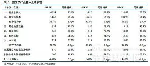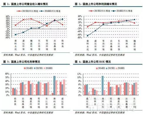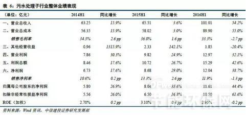 而污水处理行业上半年整体业绩增速更加出色,13家相关上市公司营业总收入为101.01亿元,比2015年同期增加35.50亿元,增幅54.2%;营业总成本为89.9亿元,比2015年同期增加31.88亿元,增幅55.0%;营业利润为12.97亿元,同比增加3.15亿元,增幅32.1%;归属于母公司净利润11.61亿元,同比增加3.57亿元,增幅44.4%。行业整体毛利率为33.3%,同比下降2.7个百分点;整体净利率为11.9%,同比下降1.3个百分点;平均ROE为2.95%,同比下降0.2个百分点。