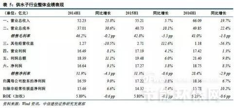 2015年4月“水十条”的颁布,掀起了行业的投资浪潮。PPP项目的推行,对水处理行业的发展起到积极影响作用,大部分公司的业绩呈上升趋势。如今一年多过去,从行业发展趋势来看,水务运营行业已经进入稳步增长期。截至2016年上半年末,我们关注的6家供水相关上市公司营业总收入为66.09亿元,比2015年同期增加10.88亿元,增幅19.7%;营业总成本为49.85亿元,比2015年同期增加9.12亿元,增幅22.4%;营业利润为17.42亿元,同比增加0.23亿元,增幅1.3%;归属于母公司净利润18.36亿元,同比增加1.14亿元,增幅6.7%。行业整体毛利率为41.0%,同比下降1.8个百分点;整体净利率为28.4%,同比下降2.9个百分点;平均ROE为5.25%,同比下降0.6个百分点。