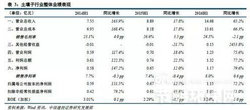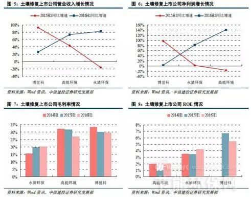 2016年上半年,土壤修复相关的3家上市公司营业总收入为14.68亿元,比2015年同期增加5.79亿元,增幅65.2%;营业总成本为13.61亿元,比2015年同期增加5.43亿元,增幅66.3%;营业利润为1.23亿元,同比增加0.53亿元,增幅75.6%;归属于母公司净利润1.15亿元,同比增加0.48亿元,增幅72.2%。行业整体毛利率为24.5%,同比下降2.1个百分点;整体净利率为8.0%,同比上升0.6个百分点;平均ROE为3.24%,同比上升1.0个百分点。