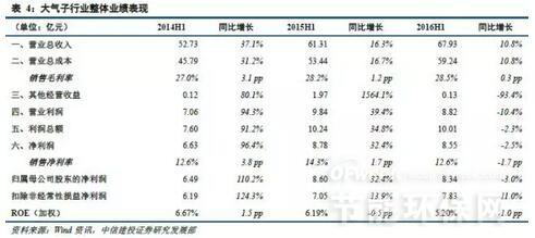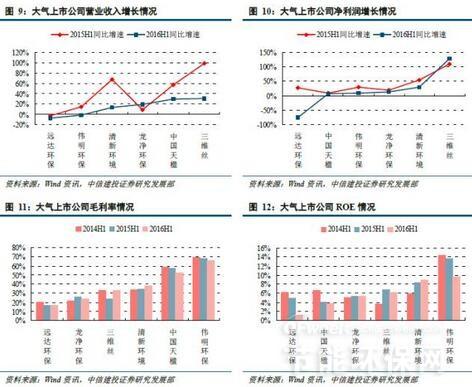 大气投资的浪潮已行近尾声,企业运营状况分化加剧。由于市场预期较为充分,行业的发展较为平稳。截至2016年上半年末,与大气相关的6家上市公司营业总收入为67.93亿元,比2015年同期增加6.62亿元,增幅10.8%;营业总成本为59.24亿元,比2015年同期增加5.80亿元,增幅10.8%;营业利润为8.82亿元,同比减少1.02亿元,降幅10.4%;归属于母公司净利润8.34亿元,同比减少0.26亿元,降幅3.0%。行业整体毛利率为28.5%,同比提高0.3个百分点;整体净利率为12.6%,同比下降1.7个百分点;平均ROE为5.20%,同比下降1.0个百分点。
