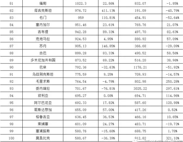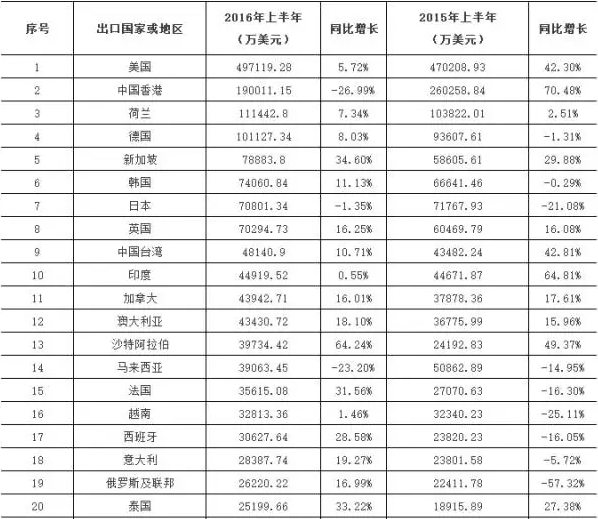2015&2016年上半年中国LED十大重点领域出口国家或地区TOP100