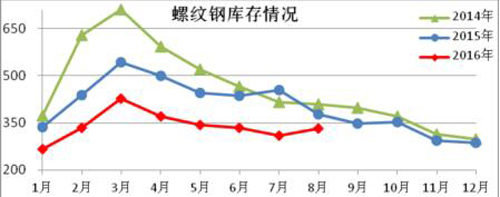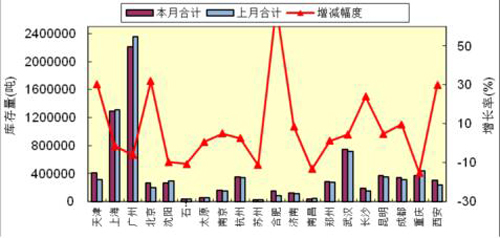本月螺纹钢库存增加的地区有13个,其中增加较多的地区有天津,库存增加4.8万吨,其中钢材市场增加4.0万吨,港口增加0.8万吨;北京库存增加6.2万吨,南京0.6万吨,杭州1.7万吨,合肥5.7万吨,济南0.1万吨,郑州0.7万吨,武汉0.8万吨,长沙4.4万吨,昆明0.4万吨,成都2.4万吨,西安5.3万吨;库存减少的地区有5个,其中减少较多的地区有广州,库存减少2.7万吨,其中钢材市场减少0.6万吨,港口减少2.1万吨;沈阳库存减少2.5万吨,苏州0.3万吨,重庆4.6万吨。