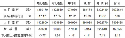 本月5大品种钢材库存合计略有上升,其中热轧卷板库存环比下降3.77%,冷轧卷板库存环比上升1.28%,中厚板库存环比下降1.81%,线材库存环比下降1.11%,螺纹钢库存环比上升7.43%,详见下表。
