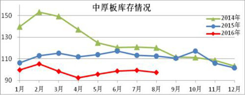中厚板本月库存97.4万吨,比上月减少1.8万吨,下降1.81%(具体见图6)。其中钢材市场库存80.3万吨,比上月减少1.5万吨,港口库存17.1万吨,比上月减少0.3万吨。