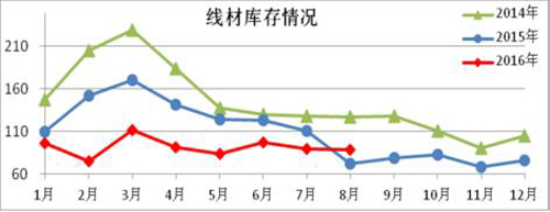 本月线材库存增加的地区有7个,其中增加较多的地区有合肥,库存增加0.2万吨,武汉0.1万吨,昆明1.0万吨,成都1.6万吨,西安1.5万吨。库存减少的地区有12个,其中减少较多的地区有天津,库存减少2.0万吨,其