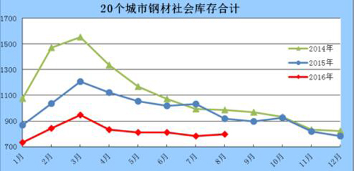 2016年8月,全国20个城市5大类品种钢材社会库存合计环比略有上升,其中螺纹钢库存上升幅度较大,环比增幅达7.43%。本月库存总量797.3万吨,环比增加16.6万吨,上升2.13%。其中钢材市场库存总量705.6万吨,比上月增加21.3万吨,上升3.12%;港口库存91.7万吨,比上月减少4.7万吨,下降4.91%。具体见图1、图2、图3。