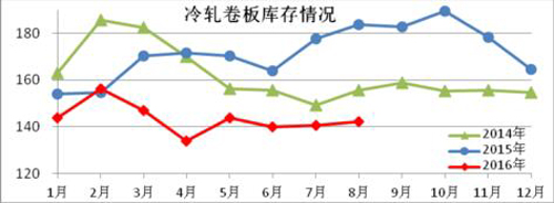 本月冷轧卷板库存增加的地区有6个,其中增加较多的地区有天津,库存增加1.8万吨,其中钢材市场增加2.5万吨,港口减少0.7万吨;上海库存增加0.5万吨,其中钢材市场增加1.0万吨,港口减少0.5万吨;济南库存增加0.3万吨,武汉2.0万吨,西安0.2万吨;本月库存减少的地区有8个,其中减少较多地区有广州,库存减少1.9万吨,全部为钢材市场减少量;沈阳库存减少0.1万吨,郑州0.1万吨,长沙0.4万吨,重庆0.3万吨。