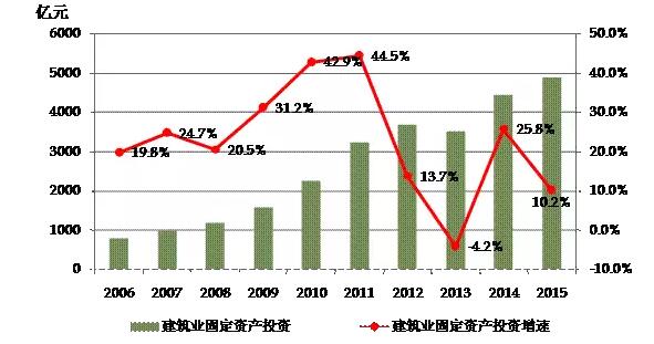 ▲ 图4 2006-2015年建筑业固定资产投资及增速