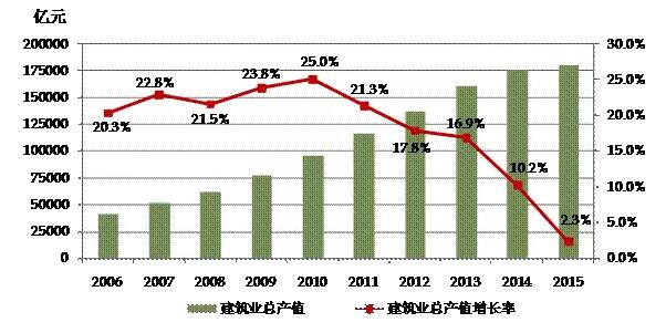 2006年以来,随着我国建筑业企业生产和经营规模的不断扩大,建筑业总产值持续增长,2015年达到180757.47亿元。但建筑业总产值在经过2006年至2011年连续6年超过20%的高速增长后,增速持续下降。2015年增速仅为2.3%,下行趋势显着(图5)。