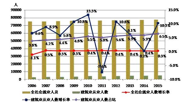▲ 图6 2006-2015年全社会就业人员总数、建筑业从业人数增长情况