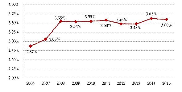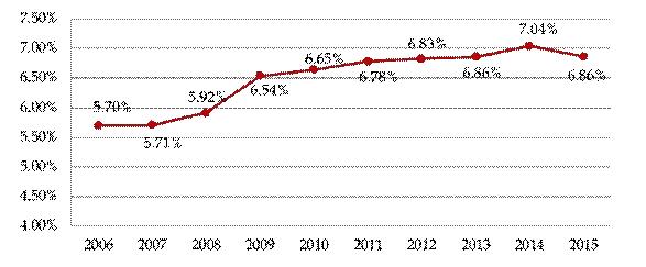 ▲ 图2 2006-2015年建筑业增加值占国内生产总值比重