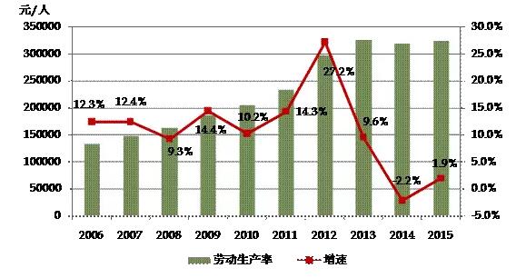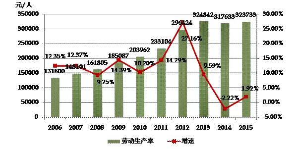▲ 图8 2006-2015年按建筑业总产值计算的建筑业劳动生产率及增速