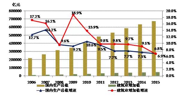 ▲ 图1 2006-2015年国内生产总值、建筑业增加值及增速