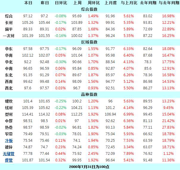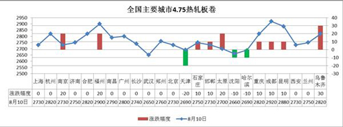 8月10日扁平材指数报89.33点,较上一交易日上涨0.02%。其中,热轧板卷指数和中厚板指数分别下跌0.02%和上涨0.01%。今日热卷期货1610合约午后震荡偏强,收2754跌0.33%,缩量减仓。南京、福州、太原、成都等9个地区价格上涨10—30元/吨,天津、沈阳、哈尔滨市场价格下跌10—20元/吨。