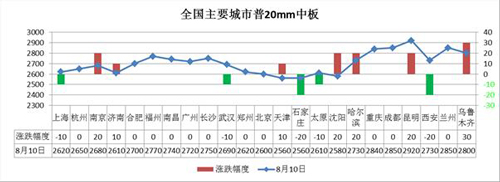 上海市场中板价格继续小幅下跌,在期货盘整走弱的影响下,商家加快了出货节奏和力度,加之周边资源的流入,预计明日市场价格多继续偏弱运行。天津市场价格小幅上涨,市场观望情绪渐浓,成交较差,不过多数商家对8-9月份市场较为看好,认为价格易涨难跌,因此也并不着急甩货,预计短期市场价格多以盘整为主。10日,全国23个主要市场普20mm中板价格报2703元/吨,较上一交易日价格上涨2元/吨。