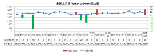 上海市场价格暂稳运行,在期货和成交走弱下,商家暗降出货,但成交较差,不过钢坯午后小涨,商家观望情绪加重,预计明日市场价格多盘整运行。京津市场价格继续下跌,期货市场走跌对现货影响较大,虽然商家降价,但成交依然不畅,预计明日市场或盘整观望为主。10日,全国25个主要市场HRB400(20mm)螺纹钢价格报2564元/吨,较上一交易日价格下跌3元/吨。