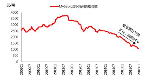 具体来看,2015年年初时,MySSpic废钢绝对价格指数在1925.9元/吨,此后一路下滑,至7月底的1253.7元/吨,已累计下跌672.2元/吨,降幅达35%。7月末钢材价格出现反弹,受此带动,废钢价格在8月份也出现了一个月左右的短期反弹,到8月底价格升至1368元/吨,反弹幅度在114.3元/吨,涨幅为9%。此后伴随钢材需求疲软,价格再次下滑的情况,废钢价格再次进入下跌的通道。9、10、11月份均单边下滑,截止12月底,价格已跌至1074.4元/吨,创下金融危机以来的历史最低价格。
