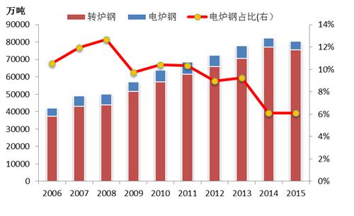 2015年,我国粗钢产量80382万吨,同比下降2.35%,自1981年以来首次出现负增长。而在2014年粗钢产量达到阶段性峰值的时候,电炉钢的产量已经开始下滑,由2013年的7200万吨,下降至5016万吨,降幅达到30%。2015年,电炉钢产量继续下跌,降至4903万吨,占粗钢产量比例仅在6.1%,为近年来的最低占比,远低于全球电炉钢/粗钢产量25.1%的占比。