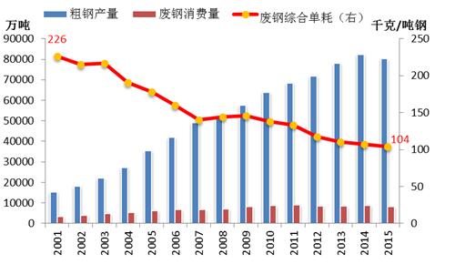 2015年,我国粗钢产量80382万吨,同比下降2.35%,自1981年以来首次出现负增长。后金融危机时代,世界经济增长乏力,大宗商品需求放缓,价格波动起伏,特别是铁矿石价格大幅下跌,我国铁矿石进口量持续增长。2015年我国进口铁矿石95272万吨,同比增长2%,创历史新高,且我国对外的依存度突破了历史峰值,已超过了80%。钢铁企业在困境中继续采取“多吃矿石,少用废钢”的炼钢工艺,致使废钢消耗量出现负增长,废钢综合单耗持续下降,且废钢价格的大幅下挫也导致废钢回收企业经营困难,行业发展艰难。