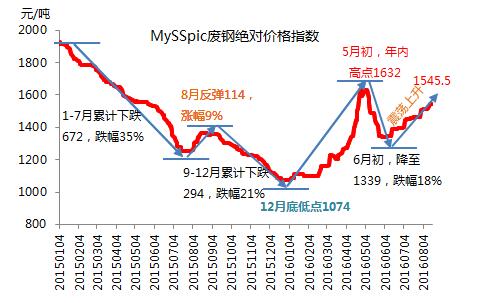 自2011-2015年,我国钢材市场持续四年单边下跌,而这一行情在2016年迎来反转。上半年,主要由于市场供需错配,资金推动,黑色系期现货联动导致国内钢材价格急涨快跌,波动幅度近1000元/吨。在此背景下,废钢市场亦走出跟钢市一致的行情。年初至今,价格呈侧“N”型走势,从MySSpic废钢绝对价格指数来看,由年初至5月初,指数由低位时的1074.4元/吨,一路上行迄今的年内高点1632.3元/吨,累计涨幅达到557.9元/吨(或52%),涨幅巨大。接着进入急跌的第二阶段,即一月内价格暴跌293.1元/吨至1339.2元/吨,跌幅近18%。6月中旬开始,伴随钢材价格暴跌后的反弹,废钢亦开启“震荡上行”之旅,截至8月18日,价格反弹至1545.5元/吨,涨幅为206.3元/吨(或15.4%)。废钢价格的涨跌波动,主要受到钢材市场运行趋势的影响,废钢资源供应的紧缺或者宽松,构成短期内厂商博弈的砝码。