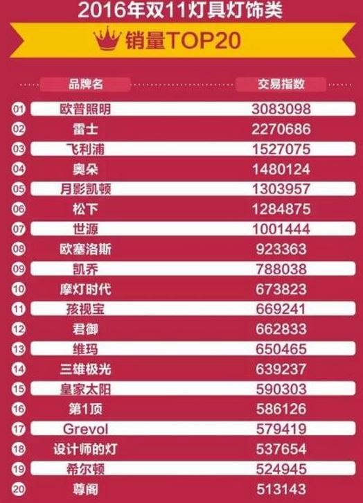 从激战正酣的双十一,各家照商浑身解数,都亮出了自己最好的成绩单,其中最为瞩目的数欧普照明,其当天总成交额达到2.046亿,再创行业奇迹。同时雷士照明、飞利浦、奥朵、松下等品牌也有不俗的表现。