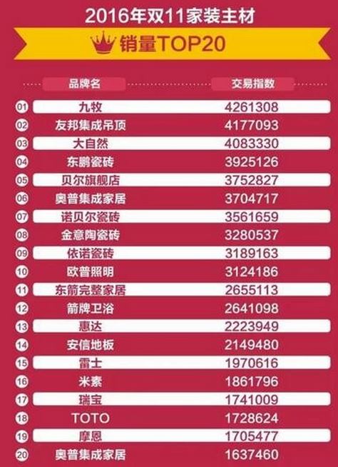 从生意参谋中的数据显示,在家居建材大类品牌排名中,分别为九牧、友邦集成吊顶、大自然、东鹏瓷砖、贝尔旗舰店、奥普集成家居、诺贝尔瓷砖、金意陶瓷砖、依诺瓷砖、欧普照明等。而在照明行业只有欧普照明、雷士照明两个灯具品牌,进入家装建材大类排行前20名。