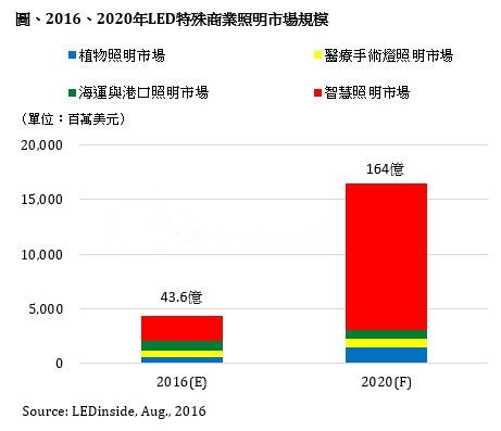 根据最新研究数据显示,包含植物照明、医疗手术灯照明、海运与港口照明及智慧照明在内的四大特殊商业照明市场逐渐受到市场关注,2016年LED全球特殊商业照明市场规模为43.6亿美元,至2020年将上看164亿美元,2016年至2020年复合成长率达30%。