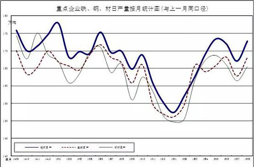 2016年8月中旬,94家重点监测钢铁企业(集团口径)本旬共生产粗钢1749.04万吨、生铁1694.76万吨、钢材1673.0万吨、焦炭347.88万吨。日产量及比上一旬增减情况分别为:粗钢174.90万吨,增产5.05万吨,增幅2.97%;生铁169.48万吨,增产1.85万吨,增幅1.10%;钢材167.36万吨,增产4.31万吨,增幅2.64%;焦炭34.79万吨,增产0.63万吨,增幅1.84%。